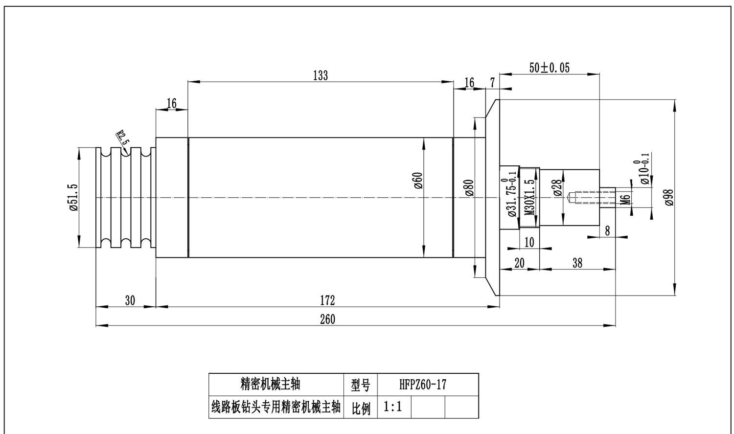 內(nèi)容描述: 該產(chǎn)品是我公司根據(jù)用戶要求并融合公司20年的設計經(jīng)驗而設計的幾款專用電主軸 具有高精度 長壽命可靠穩(wěn)定性等優(yōu)點 ,適用于各類微型鉆頭的磨削 轉速從4000--12000rpm,功率0.5--1.5KW,電主軸采用氣密封和機械密封,冷卻方式采用循環(huán)油冷/水冷 機械主軸自冷 機械精度如下:1>同心度:內(nèi)外圓同心度≤0.003mm,2>靜特旋轉精度:主軸的外錐回轉精度≤0.001mm 端面跳...